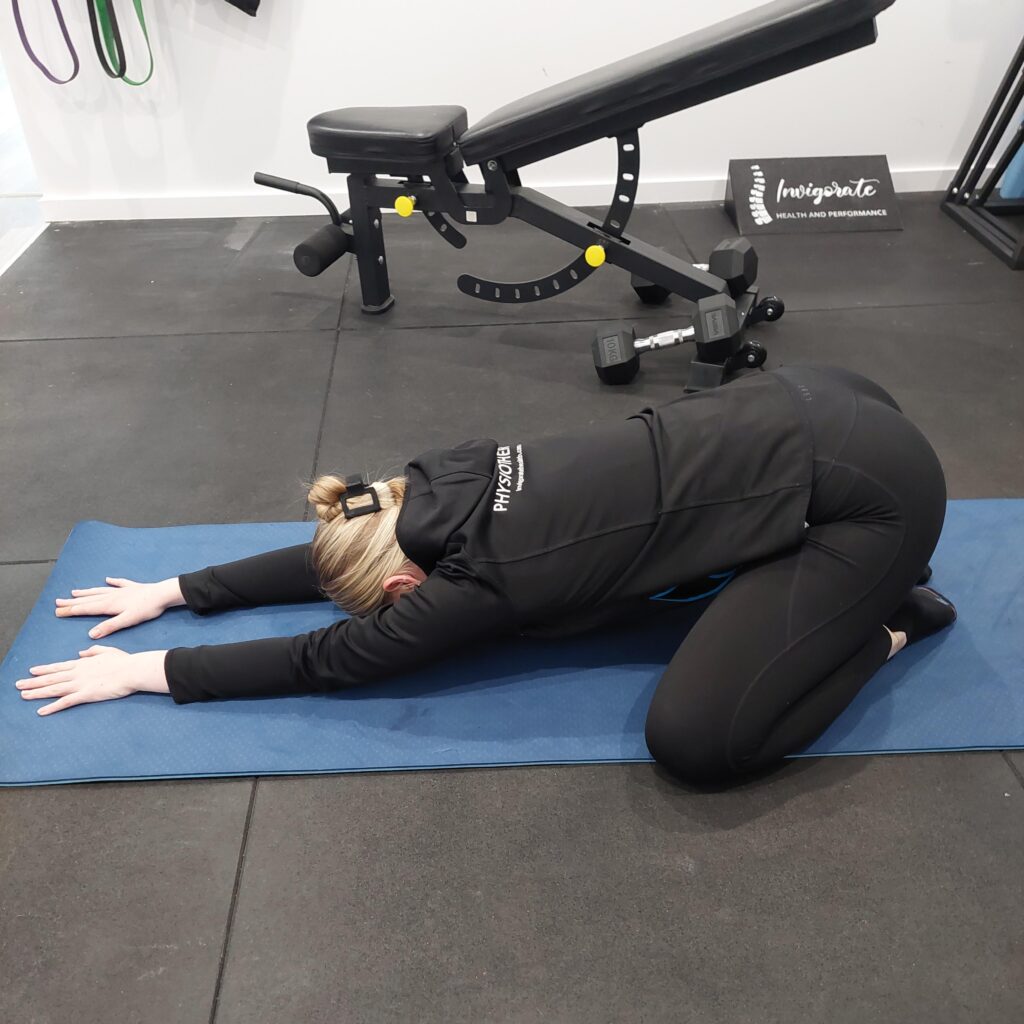 Relax into this position, allowing your back, hips, and thighs to gently stretch. Continue relaxing into this pose for around 1 minute. (You can do more or less depending on your comfort level.)